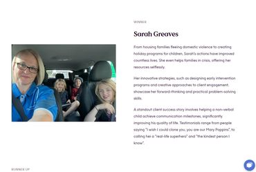 From housing families fleeing domestic violence to creating holiday programs for children, Sarah's actions have improved countless lives. She even helps families in crisis, offering her resources selflessly.