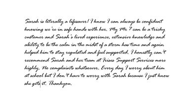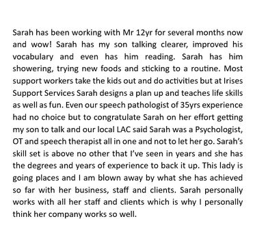 A standout client success story involves helping a non-verbal child achieve communication milestones, significantly improving his quality of life. Testimonials range from people saying "I wish I could clone you, you are our Mary Poppins", to calling her a "real-life superhero" and "the kindest person I know".
